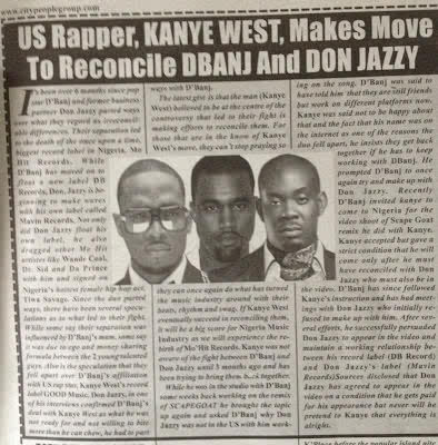 In today's edition of City People; "Kanye West, believed to be at the center of the controversy that led to their fight is making efforts to reconcile them… Kanye West was not aware of the fight between D'Banj and Don Jazzy until 3 months ago and has been trying to get them together….. while he was in the studio with D'Banj some weeks back working on the remix of "Scapegoat" he brought the topic up again and asked D'banj why Don Jazzy was not in the US with him working on the song. D'Banj was said to have told him that they are still friends but work on different platforms now. Kanye was said not to be happy about the fact that his name was in the internet as one of the reasons the duo fell apart. He insists they get back together if he has to keep working with D'banj. He prompted D'Banj to once again try and make up with Don Jazzy. Recently D'Banj invited Kanye West to come to Nigeria for the video shoot of "Scape Goat" remix he did with Kanye. Kanye accepted but gave a strict condition that he will come only after he must have reconciled with Don Jazzy who must also be in the video. And after several attempts by D'Banj, Don Jazzy agreed to appear in the video on a condition that he gets paid for his appearance."