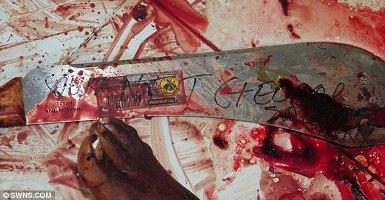Another chilling message was scrawled onto the other side of the blade that read 'Your Next George Sawyer'.