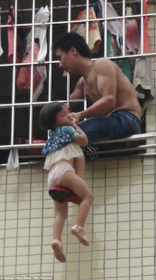 This Chinese man, under the influence of drugs, dangled his terrified 3 year old daughter out of a 6th floor window after having an argument with the girl's mother. This happened over the weekend in Guangzhou, capital of China's Guangdong province.Neighbours said that the man opened the window at about 10.30am, and then calmly sat on the edge while dangling his daughter above the drop below.