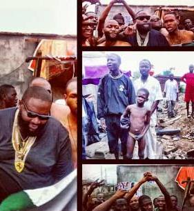 Its no longer news that Ricky Rose is in the country for the Summer Jam concert. Well he visited Sura Market, Obalende yesterday afternoon and shot some scenes for his 'Hold Me Back' video and trust Nigerians to troop in in numbers just to see Rick Ross and be in his video! Apparently, he also wants out of our oil money. He tweeted about it and also about his nice gesture. Apparently, he bought a whole grocery store and distributed its contents to those around. How sweet!!
